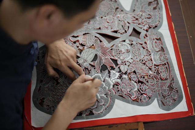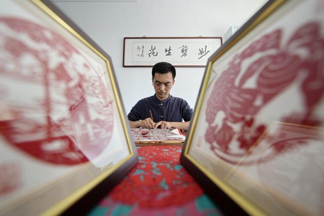 9月16日,剪纸艺人在玉田县“非遗会客厅”工作室内创作剪纸作品。 新华社记者 牟宇 摄