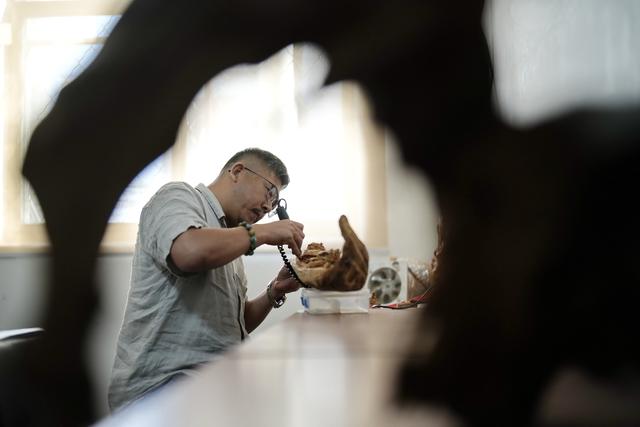 9月16日,玉田木雕艺人在玉田县“非遗会客厅”工作室内制作木雕。 新华社记者 牟宇 摄