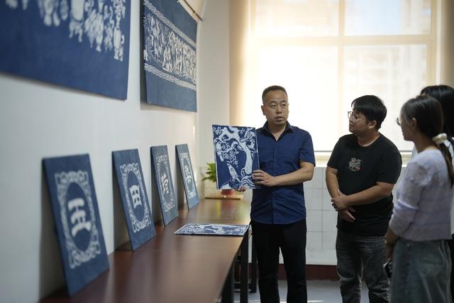 9月16日,玉田蜡染艺人在玉田县“非遗会客厅”工作室内向参观者介绍蜡染作品。 新华社记者 牟宇 摄